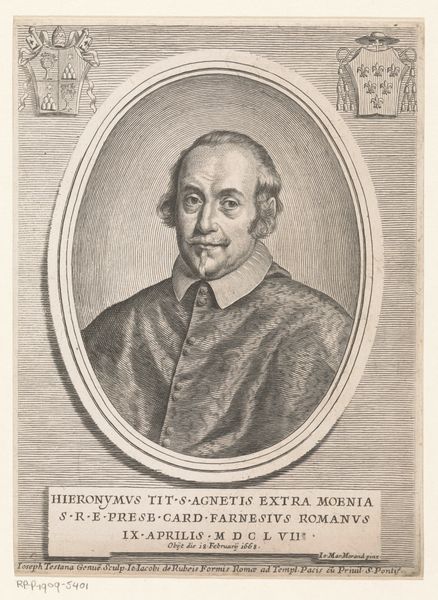 Louise Magdeleine Horthemels created this print, *Portret van Abel-Louis de Sainte-Marthe,* using engraving techniques. The composition is immediately striking for its geometric clarity, built upon contrasting forms. The oval frame, a soft continuous curve, contains the portrait, contrasting sharply with the rectangular base featuring strong horizontal lines. This structure creates a visual dialogue between the fluidity of life and the rigidity of societal expectations. Horthemels employs a semiotic system through line and form; the detailed hatching and cross-hatching define Sainte-Marthe's features, suggesting depth and character. The framing elements symbolize containment and presentation, common in portraiture of the time. Yet, the artist disrupts this convention by integrating the portrait with textual information, blurring the line between the individual and his public role. Ultimately, it challenges the viewer to consider how identity is both constructed and perceived, framed by both artistic choices and societal context.