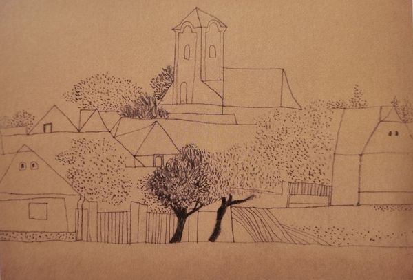 Curator: This drawing is entitled "Houses in Szentendre 225x300 Pencil on Paper" by Lajos Vajda. It's a pencil drawing on paper showcasing Vajda's exploration of urban landscapes. Editor: It has a sort of ghostly serenity, almost weightless. The simplicity of the lines is striking. The shapes and forms hover on the page; an evocation of a place. Curator: Note how the linear perspective and geometric abstraction merge. Vajda’s reduction of the houses to basic shapes emphasizes the formal composition. Consider, also, the contrast between the geometric forms of the buildings and the relative textural effects on the page. Editor: Those simplified lines carry significant cultural weight. Houses often represent belonging and the self, yet here they're rendered almost as skeletal structures. Szentendre was an artist's colony with powerful spiritual resonance in Vajda's time. Are these houses containers of memory, or fragile monuments to a fading cultural identity? The tower looms above. Is that meant to evoke church bells? Curator: One might consider the symbolism of the abstracted structures, however, for me it’s about the internal relationships of shape and space that hold it all together. See how the various angles interact; lines create a harmonious tension across the picture plane, and note, for example, the placement of geometric forms in the drawing and how each connects to the other via line, angle, and juxtaposition. Editor: Perhaps Vajda saw those same connecting threads but interpreted them as conduits of shared experience or history—that reaching for a collective unconscious? That high tower, for instance, is a persistent architectural and cultural symbol that echoes across civilizations. It acts as an anchor—literally the high point on the picture plane, but perhaps symbolically as well, standing as a visual metaphor for shared community, continuity, or cultural heritage. Curator: Indeed. Whether one sees abstracted forms or the outlines of cultural symbols, it provides for intense contemplation of modern art and being. Editor: It certainly provides a quiet space for reflecting on history, belonging, and memory.