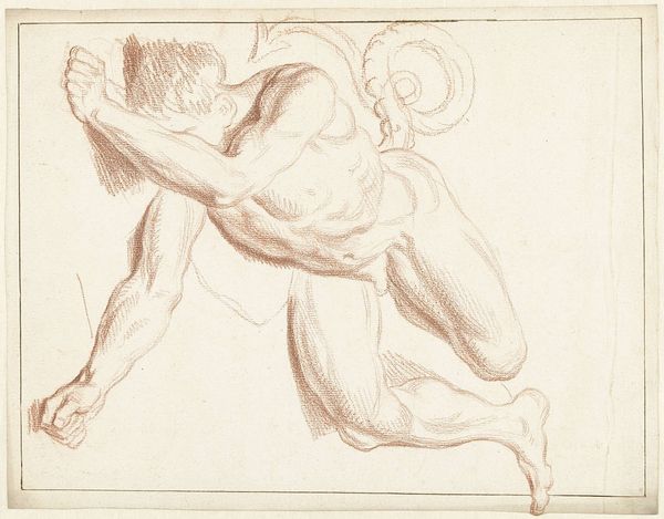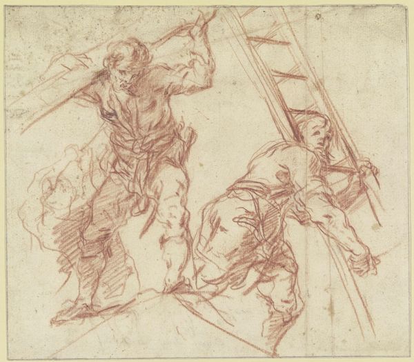 Curator: This pencil and chalk drawing is titled _Studie nach Raffaels Vertreibung Heliodors aus dem Tempel sowie weibliche Figuren_, and was created by Nicolas Poussin between 1512 and 1514. Editor: My first impression is one of dynamism and subdued power. The figures are caught in moments of extreme exertion, but the muted tones create a strange quietness, a moment caught before the storm. Curator: Indeed, we see Poussin engaging with Raphael’s fresco, “The Expulsion of Heliodorus from the Temple." Poussin's act of studying Raphael’s work speaks volumes. It's a dialogue across time, an echo of artistic lineage, especially given the subject matter, which references divine intervention and the purification of sacred space. It really highlights the enduring impact that classical compositions can have. Editor: It's a shame he reproduced that same symbolic violence. Given its depiction of authority forcibly removing someone deemed unworthy from a holy place, do you think this relates to themes of religious or cultural supremacy that were circulating at the time? Who does that kind of symbolism really serve? Curator: I can see your concern, but in its historical context, this can also speak to broader struggles for justice, even if the symbolism is problematic for modern viewers. I'd suggest Poussin uses the original fresco as a template for understanding compositional rhythm. Look at how the dramatic tension is created with these bold diagonal lines, like invisible vectors of force, but more subtle, since these preliminary figures lack a distinctive location. The layering of these figures suggests the artist's quest to fully conceptualize how forces impact one another. Editor: I see what you mean about composition. There is almost a choreographer-like way he moves the figures. But I feel that, stripped of Raphael's narrative, the raw physical action becomes almost abstracted, leaving questions about authority and its expression through violence more in focus. That focus on brute action could have a potentially empowering reading, but I do wish there was space given for alternative readings that were not so closely tied to religion. Curator: Perhaps Poussin sought an ideal form by synthesizing and reworking a renowned masterpiece. It also illustrates a fascinating interplay of appropriation, influence, and reinterpretation across the ages. Thank you for this discussion; it enriched our view on this compelling image. Editor: Likewise; considering the role of art in perpetuating power is always valuable, especially when we view older pieces.