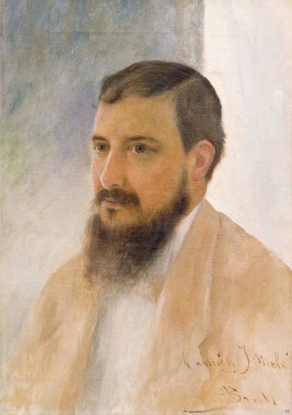 Curator: Standing before us, we have "Man from the Santacroce Family," painted by Francesco Salviati, also known as Cecchino, an important figure of the Italian Renaissance. What’s your take on it at first glance? Editor: Brooding! He seems a touch melancholy, doesn't he? The stark contrast of the black against the creamy backdrop enhances that mood. I’m also drawn to how the light plays across his face and hands, leaving his clothing rather undifferentiated in texture. Curator: That contrast really emphasizes his presence. I see him almost caught between worlds: those sculptural figures hint at classicism, while his sombre gaze draws you into his own psyche. The draped fabric provides a splash of richness in the scene as well. Editor: Absolutely, the fabrication speaks of someone wanting to create both opulence and seriousness. It has this weight, in both subject matter and technique. What can you tell me about its crafting? The oil paint on what seems to be a rather large canvas – it is definitely commanding space, or so it seems. Curator: Well, Salviati, being deeply entrenched in the Mannerist style, often focused on elongated figures and exaggerated gestures to show off technical prowess. You can observe that elongation and emphasis of the gesture of his fingers particularly here, drawing attention and implying nobility, the hands giving the painting balance in symmetry with his face and beard. But with oil paint, you can achieve that precise shadowing to allow that gaze to speak. Editor: Exactly! His clothes are almost swallowed, it does give a weight and depth to the portrait that can't go unmentioned. Thinking of his costume though, it reminds me how much the social context influenced the accessibility to the materials required. Curator: I'm sensing the hand of someone thinking deeply and maybe even questioning what it means to exist. Editor: Exactly, you read my mind, perhaps a meditation on the materials of life, in addition to paints! That gaze, as mentioned before, isn't just sad – it contains the questions that resonate in oil and canvas. Curator: Well said. Salviati successfully communicates profound emotions in this mysterious work! Editor: Yes, that combination of emotional insight into materiality of social history of the era. Profound is truly fitting.