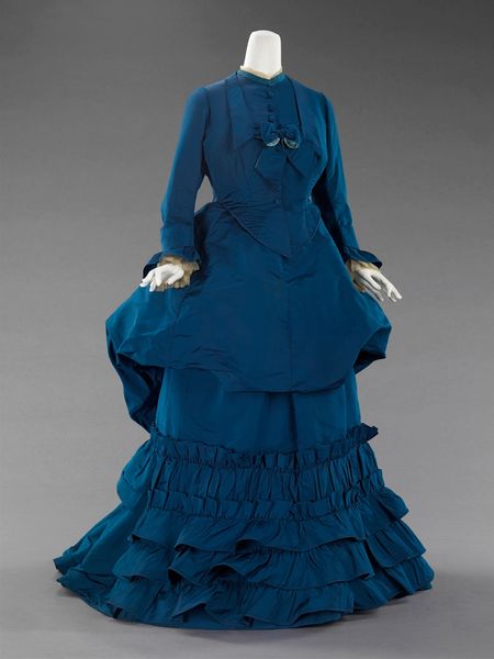 This dress was created by Emile Pingat sometime during his lifetime from 1860 to 1896. Note the dominant, near-monochromatic use of dark blue, which lends the garment a sombre yet sophisticated air. The eye is immediately drawn to the complex interplay of textures, from the subtle dotted pattern on the bodice to the lush velvet accents and delicate lace trim. The dress’s structure is highly articulated, dividing the body into distinct zones that emphasize the waist and bust. This division speaks to the era's preoccupation with defining and controlling the female form through fashion. Consider how the meticulous tailoring and ornamentation invite a reading of societal codes and expectations. The emphasis is not merely on beauty, but on communicating status and adhering to specific ideals of femininity. Ultimately, this dress is more than a piece of clothing; it is a carefully constructed statement about identity and social positioning. By examining its visual elements and their arrangement, we uncover the complex dialogues between art, culture, and personal expression.