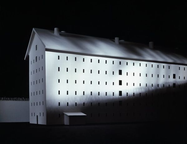Curator: James Casebere's "Prison (Sing Sing)" is a powerful image, stark and haunting, measuring approximately 47 by 56 centimeters. Editor: It feels very cold, almost sterile. The high contrast and repetitive window pattern give it a sense of oppressive uniformity. Curator: Casebere constructs these scenes as models, emphasizing the constructed nature of our realities and raising questions about confinement, both physical and psychological, within social systems. Consider the implications of Sing Sing's history. Editor: Exactly, and the materials—plaster, simple construction. There's a sense of labor, of mass production even in representing this supposedly unique, monumental space. Curator: It speaks volumes about power structures, the gaze, and the lived experience within such institutions, reflecting broader conversations around race, class, and justice. Editor: Right. The image isolates the architecture itself, forcing us to confront the system's concrete reality. Curator: Indeed, a chilling commentary on institutional control. Editor: It certainly gives you a lot to consider.