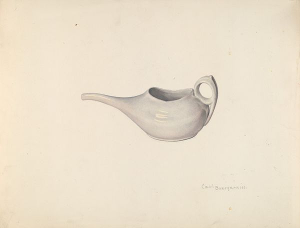 Editor: This is LeRoy Griffith’s "Covered Dish (Duck)," created around 1938. It appears to be a drawing using pencil, and perhaps watercolor. It's surprisingly calming. I'm intrigued by the level of detail, especially in the woven texture of the basket. What formal qualities stand out to you in this drawing? Curator: Formally, the emphasis lies in the interplay of line and texture. The delicate pencil strokes delineate the form of the duck and the intricate weave of the basket. Notice how Griffith uses subtle tonal variations to create a sense of depth and volume, despite the limited color palette. The light seems evenly distributed, highlighting the meticulous craftsmanship. Editor: The basket weave does draw my eye. The texture contrasts smoothly against the sleek form of the duck. Why this focus on a domestic object, do you think? Curator: Indeed. Consider the geometry in play here. The circular base grounds the form, offering stability. The duck itself, while organic, is simplified into elegant curves and planes. Griffith seems less interested in realistic representation and more interested in the formal arrangement of shapes and textures. How does the symmetry, or asymmetry, impact the overall composition, in your view? Editor: Good point. I didn’t immediately register the asymmetry. I think it gives the piece a kind of subtle dynamism, preventing it from feeling static or overly formal. Curator: Precisely. And think about the implied tactility. While it is a two-dimensional drawing, the textures invite us to imagine feeling the smooth ceramic of the duck and the rough weave of the basket. A tension is created through those textures. Editor: That's a level of visual analysis I hadn't considered! I see now how focusing on these intrinsic qualities allows for a richer understanding, devoid of cultural context. Thank you! Curator: You're welcome! Approaching art through form opens pathways to perception we often overlook.