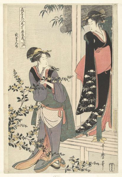Editor: This is Torii Kiyonaga's "MukÅjima kari yuki," an intriguing woodblock print residing at the Harvard Art Museums. The subdued color palette gives it such a quiet, contemplative feel. What draws your eye, what do you see in this piece? Curator: The way Kiyonaga captures a fleeting moment, like a shared secret between these women. It's less about grand narratives and more about the poetry of everyday life, those transient moments of beauty we often overlook. Editor: So it’s like a snapshot of regular life in that period? Curator: Yes, but elevated! Look at the graceful lines, the subtle gradations of color. Kiyonaga wasn't just recording life; he was idealizing it, finding the extraordinary in the ordinary. A reminder, perhaps, to find beauty in our own everyday moments. Editor: I see it now, thanks! It’s amazing how much a simple image can reveal.