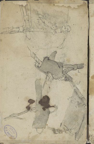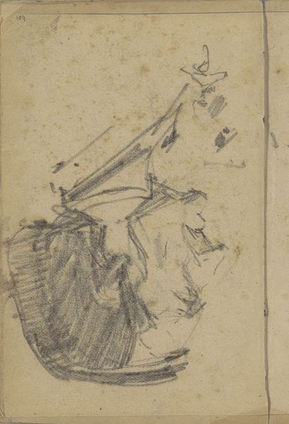 Curator: Before us is George Hendrik Breitner's "Gezadeld Paard," or "Saddled Horse," created between 1880 and 1882. It's currently held at the Rijksmuseum. Editor: It has the immediacy of a quickly captured moment. I'm drawn to the lightness of touch; those pencil lines create a powerful impression with incredible efficiency. Curator: Breitner, known for documenting Amsterdam's street life, often used sketchbooks. The work itself embodies a sort of artistic labor and reflects Breitner's dedication to capturing reality. Editor: The lines coalesce just enough to define form and space, it also reminds of Japanese sumi-e ink wash painting in terms of style and composition. But tell me, considering it’s just a quick sketch, what sort of audience was he considering while making the work? Curator: Considering this piece comes from a personal sketchbook, the primary audience would most likely have been himself, or possibly a close friend or fellow artist with whom he shared his process. This practice allows us a candid glimpse into his work... Editor: Perhaps, he’s workshopping how he could translate fleeting street scenes into his bigger canvasses, a step removed from observation? I can feel a sense of underlying construction, almost architectural. Curator: Absolutely. One might view this sketch not only as a preliminary exercise but also as a commodity in its own right. A way for the artist to test different pictorial arrangements but ultimately, produce artworks to be sold or shown. Editor: So you think Breitner saw the sketchbook page as an extension of the formal salon tradition but reframed on the scale of everyday experience? Curator: Precisely. It challenges a fixed boundary between the academic and everyday. By producing these sorts of 'drafts,' Breitner effectively turns work and labor into a form of high art that would normally reside only in traditional painting and sculpture. Editor: It shows that art, even in its most nascent stage, holds an undeniable aesthetic power and, on a more theoretical note, exposes labor conditions of representation, perhaps? Well, that gives me a lot to consider about the status of “works in progress”... Curator: It’s fascinating how much such a simple work can tell us about artmaking, the relationship of labor, and the artistic moment.