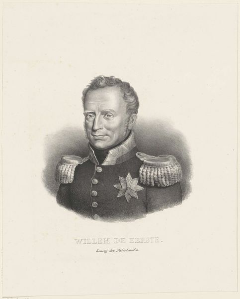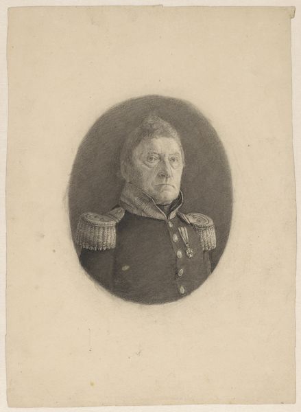 Curator: Looking at this rather imposing image, we see "Portret van koning Willem I," a pencil drawing made in 1867 by Cornelis Sebille Roos. It’s now held in the Rijksmuseum. Editor: My first impression is one of restrained power. The pencil work is delicate, but the subject exudes a formidable air, even captured simply in grayscale. It’s a compelling balance. Curator: Indeed. It’s fascinating to consider the political and social context. This was a time of evolving monarchies, where rulers had to carefully project an image of strength but also accessibility. Drawings like this often circulated widely, shaping public perception of the King. Editor: The military attire speaks volumes. Those epaulettes and the star order; visual symbols of authority, duty, and perhaps, a connection to a lineage of power. But that facial expression seems rather neutral. What could that signify? Curator: I suspect it was meant to convey an image of steady leadership. A more idealized, stoic leader figure. Too much emotion might have been seen as weakness in that era. The distribution of portrait drawings was very common back then, like sending political postcards if you will. Editor: That’s true. He is depicted without any regalia of course, that also keeps in tone with that idea of portraying authority and steady leadership, I feel. Curator: The very choice of medium – pencil rather than paint – hints at accessibility, a democratized form of portraiture, designed to circulate among a broader public rather than remaining confined to elite circles. And its value should not be understated considering how photos started getting popular around the 1860s as well. Editor: Interesting point, a statement on how and to whom should the kingdom be visually marketed. A new meaning perhaps in that perspective. Curator: Ultimately, this work shows how artists and political figures collaborated in shaping a specific, powerful, public narrative through something as simple as a pencil portrait. Editor: Exactly, analyzing such symbol is fascinating, it adds so much depth to my interpretation. Thanks for sharing this image’s background with me.