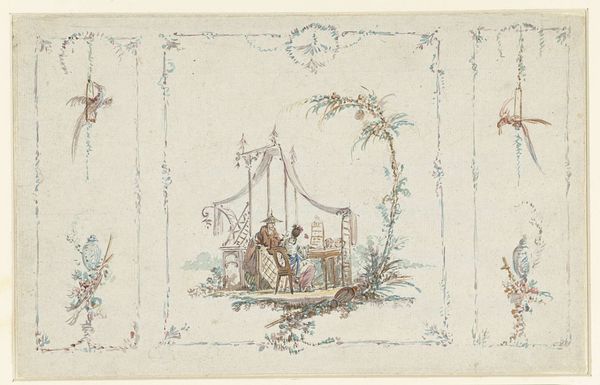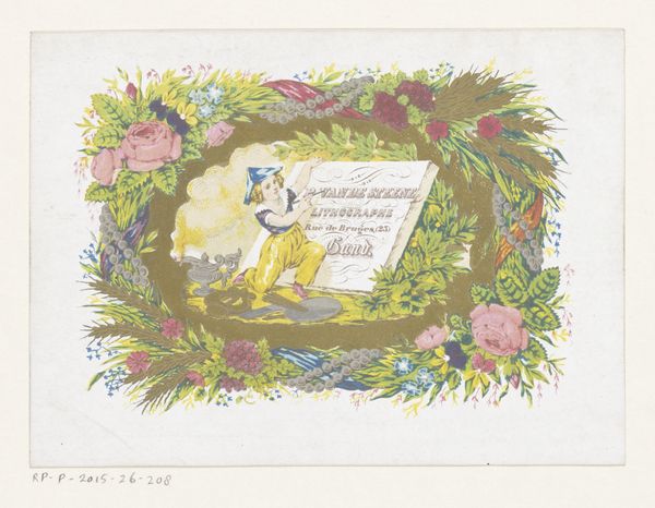 Curator: Welcome to The Art Institute of Chicago. Today, we are exploring a mid-19th century English valentine. It’s a lovely little artwork by John Windsor titled “Forget Me Not.” Editor: Intricate! The layered paper creates a compelling sense of depth and the die-cut shapes create a fascinating interplay between positive and negative space. The colour, a bright purple, seems at odds with the overall theme. Curator: That layered paper construction reflects the popular Victorian craft of paper cutting, often used to create intricate, personalized cards like this. Such items reflected a growing middle class with access to new forms of consumer goods and postal services which redefined courtship. The “Forget me not” text underscores sentimental bonds increasingly detached from landed property considerations, in other words. Editor: Absolutely. Looking closer, the silhouettes become particularly intriguing. The artist cleverly employs symmetry and repetition – the butterflies mirror each other, the trees frame the central scene. It almost feels like a stage set, which speaks volumes about constructed romantic ideal. Note the contrast between the colour applied in specific areas to amplify this symmetry of components Curator: Exactly, and we see familiar visual tropes like butterflies that symbolise transformation and rebirth, alongside floral elements expressing devotion and eternal love within that symbolic structure. Consider the “Love” inscription on the ring that joins the composition. Editor: It's fascinating how the central couple, almost obscured, become secondary to the surrounding ornamentation and textual plea: "Forget me not". The entire construction almost smothers the sentiment it intends to convey, resulting in what we might call an emotional paradox! Curator: I find your paradox very interesting, the use of ornamentation may, indeed, emphasize its importance! It underscores that while sentimental gestures became more accessible, the anxieties surrounding the permanence of relationships did not. Editor: So, a decorative surface barely masking deep-seated fears of being forgotten. I leave this artwork pondering its visual textures and implied, contradictory message! Curator: Indeed. An enduring testament to both artistry and anxiety. Thank you for joining me on this exploration!