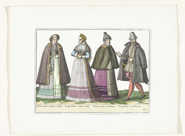 Editor: This lithograph from around 1843, titled *Volkskleederdrachten*, attributed to E. Küster, depicts different folk costumes. It feels a little like a visual catalog. What stories do you see embedded in this collection of images? Curator: Absolutely, it's crucial to understand the gaze behind such collections. These images, while seemingly documenting cultural traditions, often participated in the construction of national identities. Consider how the subjects are posed, idealized perhaps, and the very act of cataloging. What power dynamics do you think are at play when one culture attempts to document or define another, or even its own sub-groups? Editor: That’s a perspective I hadn’t fully considered. It does feel like a way of framing or even claiming ownership over these traditions. I guess I saw it as a record, but you're suggesting it's also an interpretation, one with potentially political undertones. Curator: Exactly. Think about the Romantic era and its fascination with the "folk" and the "nation." This interest wasn’t merely academic; it was deeply intertwined with emerging nationalisms and the desire to create a cohesive, unified identity, often through romanticized, and selective, representations of regional cultures. Are there details in the print itself that might point towards a particular intended audience or agenda? Editor: The groupings, maybe? How each pairing, standing side by side, suggests something about gender roles. It's less about pure representation and more about constructing relationships, social ideas. It would be interesting to explore the details further. Curator: Precisely! Each element is a carefully chosen piece of a larger narrative. Exploring such images invites us to examine the historical, social and political forces that shape how we perceive both ourselves and others. Editor: Thanks! Now I have plenty more to consider when looking at similar artworks!
