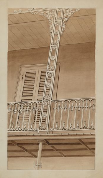 Editor: Gilbert Sackerman's "Balcony," dating from 1935 to 1942, rendered in watercolor, has such a lovely sense of quiet and stillness. What strikes me is the focus on architectural detail, but also the way the light softens those lines. How do you interpret this work? Curator: Formally, the artist utilizes a limited color palette and meticulous brushstrokes to create a nuanced portrayal of urban architecture. Note the interplay between the geometric precision of the building and the organic forms of the foliage. The structural elements like the staircase and ironwork contribute a rhythmic pattern, don't you think? Editor: I do! The railings and stairs definitely create a repetitive, almost musical feel, but then the flowers disrupt that. Curator: Precisely! This juxtaposition invites us to consider the relationship between control and spontaneity within the composition. The texture created by the watercolor further enhances the delicate balance of light and shadow, providing depth and dimensionality. Are we witnessing the formal depiction or impression of architectural objects? Editor: I hadn't thought of that! The combination of sharp lines and the watercolor softness does leave that ambiguous. Thank you for this deeper understanding. Curator: You're welcome. Analyzing how an artist manipulates medium and form can reveal profound insights into the nature of representation itself.