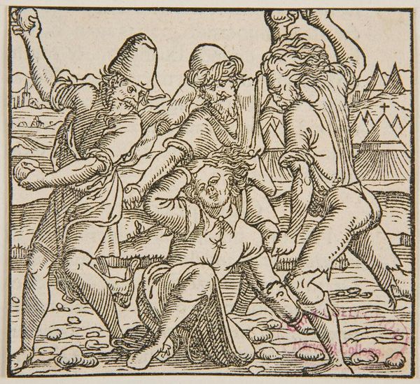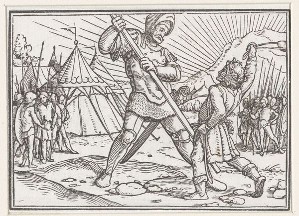 Curator: Here we have Hans Holbein the Younger's depiction of "1 Sam. XVII," immortalizing the iconic battle between David and Goliath. Editor: Immediately, the woodcut's stark contrast and the dramatic diagonal composition strike me. It's a powerful visual distillation of the biblical narrative. Curator: Holbein's choice to depict the moment of Goliath's defeat is significant. He’s tapped into the cultural memory of the underdog overcoming seemingly insurmountable odds. Editor: Absolutely. The artist uses the symbolic weight of David, a humble shepherd, to question established power structures, perhaps mirroring the socio-political tensions of his time. Curator: The sunburst radiating behind Goliath could represent divine favor shifting to David, or even the dawn of a new era. Editor: Or maybe the sun highlights the public spectacle. The artist emphasizes the role of this event in shaping communal identity. Curator: Regardless, Holbein's work allows us to reflect on themes of faith, power, and the enduring symbolism of this ancient story. Editor: It’s a testament to art's ability to translate complex narratives into resonant visual statements.