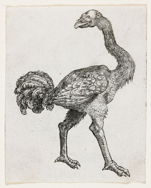 Editor: This is "Haan," an etching by Arnoud Schaepkens, created sometime between 1831 and 1904. It's a rather unassuming image of a rooster, and I’m struck by how simply it’s rendered, almost like a quick sketch. What stands out to you? Curator: The simplicity, as you noted, is deceptive. Consider the socio-economic context of 19th-century Holland. Realism, particularly depictions of everyday life, gained prominence. Domestic animals, like this rooster, appear frequently. But *why* this rooster, and why rendered in this style? Editor: I guess I hadn’t thought about that. It just seemed like a farm animal. Curator: Exactly! Schaepkens, working in a time of increasing industrialization, presents this farm animal in a very honest way. Think about the intended audience – likely middle-class city dwellers. What might a depiction of a rooster, a creature tied to the land, represent to them? Editor: Perhaps a kind of nostalgia? A yearning for a simpler life, before the cities and factories took over? Curator: Precisely. And notice how the printmaking medium makes the artwork accessible, multiplying its reach to a broad public. Could the artist's social background or beliefs influenced what he chose to portray and how he portrayed it? Editor: That’s fascinating. I’d assumed it was just a picture of a chicken! I hadn't thought about the cultural commentary embedded within it. Curator: These images become more meaningful when viewed with understanding of the society. They shape and are shaped by cultural forces. I am glad we took this time to explore that. Editor: Yes, I definitely learned something new!