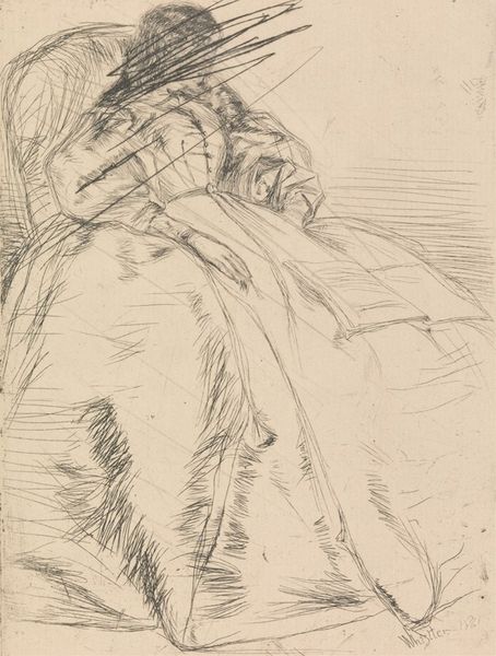 Curator: This somber work is entitled "My Dead Mother" rendered in pencil by James Ensor in 1915. Editor: Ah, the subject matter hits you right away, doesn’t it? It’s stark, like a half-formed memory struggling to stay tethered. The drawing is almost ethereal, the lines are so delicate they’re barely there. Curator: It’s compelling how Ensor confronts mortality head-on here, within an intimate, domestic sphere. You sense his grappling with personal grief in material terms, through the physical act of drawing. The pencil on paper becomes an artifact of his mourning. Editor: Artifact indeed. See how the light catches the almost haphazard sketching. It’s a whisper, a breath, quickly fading—which makes it all the more potent. Like trying to grasp smoke, or hold onto a feeling as it slips away. Was drawing his mother, or drawing death, a form of keeping it close, I wonder? Curator: It suggests a need to record, perhaps to control, a situation over which he ultimately had no power. Consider the economy of the materials: pencil, paper. Cheap, readily available. Loss, in that way, made ordinary, but also intensely personal. What can be more ordinary than paper and a pencil? Ensor transforms that. Editor: Precisely! The mundanity against the immense emotional weight. And the unfinished nature…It is a visual paradox. Look closely: even though his mother is visibly at peace and perhaps a bit distant with closed eyes and an indiscernible expression, there's a vulnerability in it. It's like the artist couldn’t fully bear to complete it, as if completion would be a final act of farewell. A labor of grief. Curator: The intimacy inherent in drawing itself amplifies the emotional impact. It becomes a tactile experience for both artist and viewer. He meticulously captures the fabric draped around her head. It's art as a type of tender labor, as you say. A way to honor a loved one's life, materially preserving a memory. Editor: It reminds me how our most profound emotions often find their voice in the simplest gestures, the lightest touch. Drawing as both elegy and raw emotional labor. Thank you for calling our attention to it.