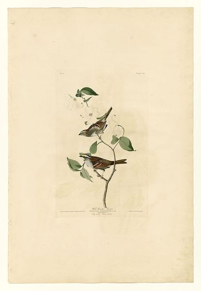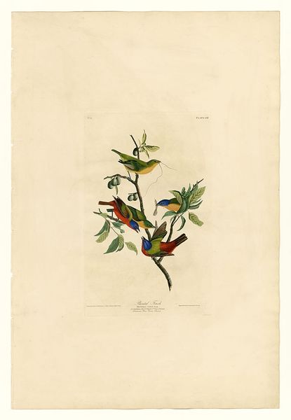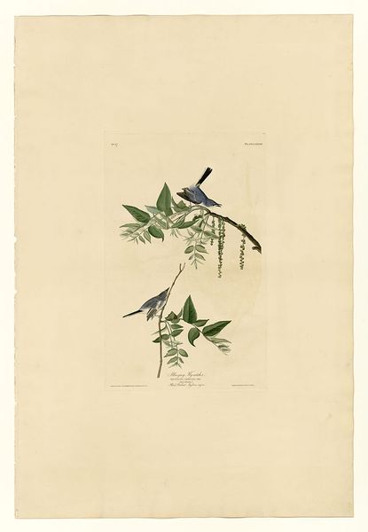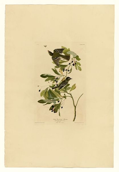 Editor: Here we have "Plate 60. Carbonated Warbler," a drawing by John James Audubon. It showcases two warblers perched on a berry-laden branch, rendered in watercolor. There’s a delicate balance between the detailed depiction of the birds and the surrounding foliage that I find compelling. How do you interpret this work, especially considering its place in art history? Curator: It’s crucial to recognize that Audubon's work exists within a complex history. On one hand, he aimed to document American birdlife, contributing significantly to ornithology. On the other hand, his work reflects a specific 19th-century worldview marked by colonial expansion and exploitation of natural resources. How does his representation of these birds, seemingly harmonious within their environment, speak to or perhaps obscure, the larger ecological impact of westward expansion and the displacement of indigenous populations? Editor: That’s a perspective I hadn't considered. It's interesting how a seemingly benign image can carry such complex historical baggage. So, the beauty of the drawing almost serves to mask the destructive realities of the time? Curator: Precisely. Think about the act of "discovery" that underpinned much of scientific exploration during that era. Whose perspectives were prioritized, and whose were erased? Audubon's meticulous depictions contributed to a scientific understanding of these birds, but at what cost to the environment and native communities that also had a relationship with these creatures? This drawing, therefore, prompts us to critically examine the relationship between art, science, and power. What do you make of the almost obsessive attention to detail? Does that reinforce this dynamic? Editor: I suppose the detail emphasizes a desire to possess and control knowledge of the natural world. It’s a far cry from simply observing and respecting it. I’ll definitely view Audubon’s work differently now. Curator: Hopefully it encourages you to approach all art, particularly representations of nature, with a more critical eye, acknowledging the intertwined social, historical, and ecological factors at play.
