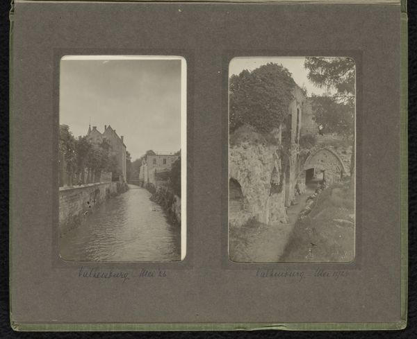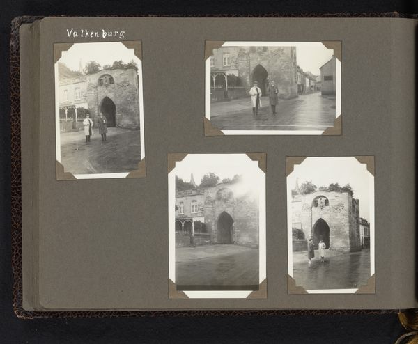 Curator: What a wonderfully unassuming photograph! This is "Bezoek aan Gulpen," or "Visit to Gulpen," dating from around 1930-1931 by Berti Hoppe. Editor: It gives me a strangely melancholic feeling. It looks like it’s pasted into a family album, three snapshots of the same visit to the old town. I find that album framework quite striking actually. It focuses attention. Curator: Absolutely. I find myself wondering about the materiality of such mementos. The texture of the album's pages, the way the photographs are adhered… it all speaks to a specific era of crafting memory, if you will. Editor: Indeed. Look at the almost eerie stillness of these street scenes. This image, this series, offers a glimpse into the social fabric of the period—a moment in time deliberately preserved within the intimate setting of the family album. What was the role of the artist as craftsperson in that historical setting? Curator: In Hoppe's time, photography was gaining traction as a new mode of documentation and reportage but I would push further and say its newness gives us insight into new industries emerging. I mean, consider how these prints, these everyday snapshots, contrast with the art photography movements flourishing at the time. We are clearly meant to notice this artist. Editor: A deliberate recording. But I'm struck by how different this feels to staged photography. It’s about witnessing life as it unfolded within this specific municipality. We should consider that as photography gained cultural capital, it also played a central role in creating images of nations, their peoples, and their ideologies. Curator: That’s such a helpful distinction. One can easily forget the politics behind the photographic gaze, given its omnipresence today. What this makes me ask is if the intention behind creating art during this period helped build a type of society around the craft of taking a photograph? Did Hoppe see a connection? Editor: Well, that's something we can continue to reflect on I think! The artist seems very keen to document something and in that vein, the artist becomes a time capsule of history for us to interpret many years later. Curator: Agreed, and considering all its many contexts makes this humble photograph all the more meaningful.