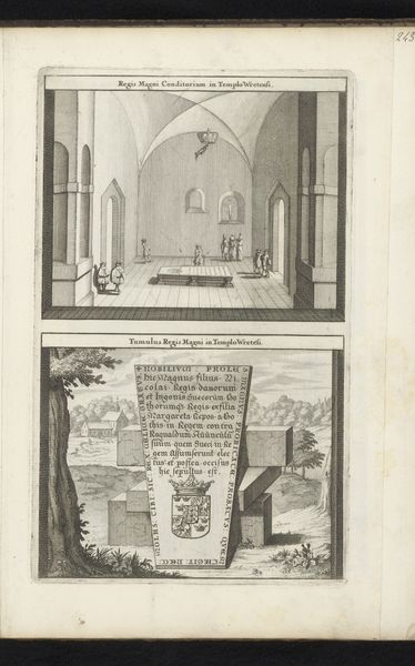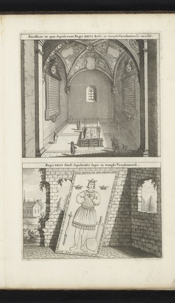 Curator: Willem Swidde’s 1692 engraving, "Kapel en grafsteen van Knoet I van Zweden in de kloosterkerk van Varnhem," presents us with two distinct yet interconnected views. It is currently housed in the Rijksmuseum. What's your immediate reaction to it? Editor: It feels stark. The precise linework, the contrast between the interior chapel and the exterior tombstone – it evokes a sense of rigid formality and perhaps the cold finality of death itself. Curator: Absolutely. Swidde's rendering offers a glimpse into 17th-century Swedish perceptions of power, faith, and remembrance. Looking closely, the upper portion illustrates the chapel's interior, filled with ornate arches and details framing what appears to be Canute I's tomb. The figures inside lend it a feeling of ceremony and hallowed space. The lower portion depicts the tombstone, presenting the late king, almost iconic in the center. The very conscious choice to give context to the place itself where his memorial can be found points toward his relevance. Editor: It's interesting how Swidde contrasts the grandeur of the chapel with the king's individual portrayal on the tombstone. The architecture speaks to the power of the institution and its rituals. Simultaneously, the engraving of Canute, surrounded by the ruins and landscape, speaks to the enduring individual legacy against the shifting tides of time and nature. The division could perhaps show both the church and nature can preserve a man's deeds in this world. Curator: I concur. The setting highlights Canute’s placement within the lineage of Swedish power. Furthermore, considering Swidde was working during a time of shifting political dynamics in Europe, the piece could comment on themes of identity and nationhood in relation to royal power. The chapel’s presence in the background subtly alludes to religious and moral dimensions of Canute's reign and impact, reminding viewers of the intersections of these power structures. Editor: So, as we reflect, this engraving prompts a wider consideration about how we create national mythologies and memorialize leadership through both architectural majesty and enduring symbolism. Curator: Precisely. Swidde's piece enables contemplation of identity, legacy, and the roles both church and state play in preserving historical memory.