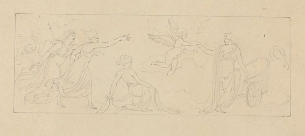 Curator: What a fascinating sketch! This is "Standing Woman and Seated Man on Either Side of a Goat" by David-Pierre Giottino Humbert de Superville, likely created between 1780 and 1849. It’s a pencil drawing. Editor: The line work is so delicate! There's a wonderful sense of airiness in the figures, especially with the goat, which seems almost translucent. I am immediately struck by how neoclassical it seems. Curator: Yes, you’ve pinpointed its movement affiliation perfectly. This sketch gestures toward neoclassicism, particularly its engagement with classical forms and ideals. We see the draped garments, the serene poses – a visual language deeply influenced by ancient Greek and Roman art. Looking at it through a contemporary lens, though, I find myself considering the gender dynamics at play. The woman stands, almost offering something to the goat, while the man is seated, seemingly observing. Editor: That's a rich interpretation. From a purely formal perspective, the composition emphasizes a clear, almost staged arrangement. The lines are clean, precise, and contribute to an overall sense of balance and harmony typical of neoclassical artwork. The composition itself creates a triangular shape from the man's posture on the right to the woman holding the goat on the left. Curator: And yet, within that balance, there's perhaps a subtle commentary on power and observation. Who gets to act and who is relegated to witnessing? The goat itself could be a symbol—perhaps of fertility, sacrifice, or even the untamed aspects of nature, mediated through these human figures. Considering the artwork was likely made at a time of political upheaval in Europe, such as the French Revolution, could this pastoral image be seen as an idyllic respite, or as commentary on the privileged classes removed from labor. Editor: It’s interesting to layer those political considerations over such clean, spare lines. To me, the artist seems most focused on the beauty and accuracy of the human form, but, of course, one does not negate the other. Curator: Indeed! It is precisely in holding these multiple readings simultaneously – the formal and the socio-political – that this modest drawing reveals its complexity and relevance, even today. Editor: It seems so understated, yet contains so much for our curiousity. It highlights how a seemingly simple composition can spark a richer discussion, doesn't it?