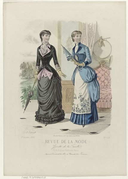Curator: This watercolor illustration is a fashion plate from an 1882 issue of *Revue de la Mode*. The artist, E. Cheffer, captured two strikingly different dress styles. Editor: Immediately, the ruffles of the blue dress seize my attention. They form layer upon layer, each a scalloped echo of the one above, culminating in this cascading spectacle of Victorian ornamentation. Curator: Fashion plates served a crucial purpose then, not just as aspiration but as coded messaging, right? Beyond mere trends, dress was—and is—always about societal standing, gender roles, and access. That blue dress, with its abundance of lace, signals wealth and leisure. Editor: Absolutely. Blue was also culturally tied to fidelity and stability. But observe the woman wearing the tan dress; her gown's relatively subdued color palette is offset by the bold plaid accents, evoking perhaps a more active lifestyle, yet one still firmly within the bounds of acceptable femininity. The symbols embedded within, almost unconsciously, speak of complex societal expectations. Curator: Right, and who has access to 'activity' or to different spheres of life? Even the jewelry box, slightly ajar, whispers of secrets and commodities only accessible to a select few. Look at the waist, too, constricted on both figures: a daily pressure experienced, predominantly, by women. These aren’t simply pretty pictures; they’re documents reflecting social norms of the time. Editor: Even the interior acts as a supporting character. The almost translucent drapes add an ephemeral, dreamlike quality to the scene. One has a sense, looking back through our current cultural lens, that beneath the surface gloss, societal constraints lingered in ways visible through these seemingly harmless sketches. Curator: Exactly. Considering our present lens, one sees that objects that initially seem like beauty standards in fact speak to how class, race, and gender intersect. Fashion, then and now, becomes a battlefield of self-expression and regulation. Editor: Looking back through a perspective that allows one to consider identity, one can examine the impact that clothing might have in projecting and shaping how one presents themselves. Curator: Indeed, revisiting pieces such as these prompts us to decode the languages of appearance, in the past and in the present, interrogating why, still, presentation continues to be bound to social structures. Editor: Thank you. It highlights how seemingly superficial visual artifacts encapsulate enduring historical and cultural conversations about the human spirit.