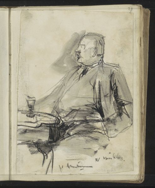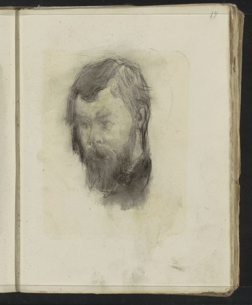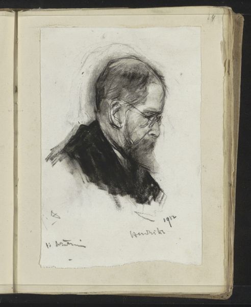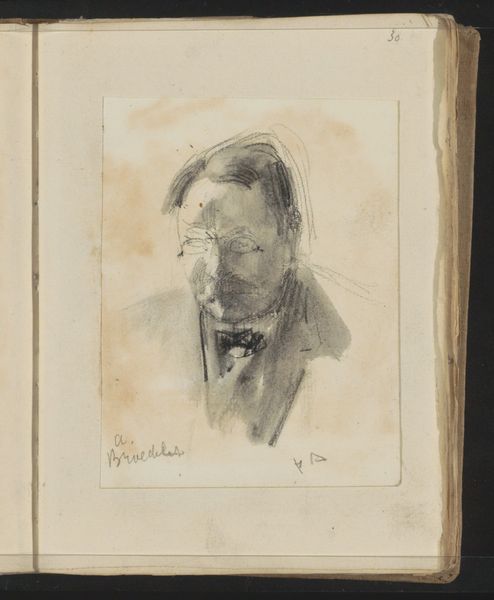 Curator: The piece before us is a quick sketch by Floris Arntzenius, dating from somewhere around 1883 to 1914. It is a portrait of the artist Berend Adrianus Bongers rendered in pencil on toned paper. Editor: My first impression is one of immediacy. The strokes are so free and unlabored; you can practically feel the artist capturing a fleeting moment. The texture of the toned paper lends it a certain warmth, too. Curator: Precisely. Note the economy of line, the way Arntzenius defines form with just a few judicious strokes. There's a structural elegance even in its incompleteness. The glasses, for example, are simplified into essential shapes, becoming more than just eyewear, and forming abstract geometric forms. Editor: Glasses as signifiers of intellect, perhaps? Bongers, with his spectacles and somewhat severe profile, comes across as a figure deeply engrossed in thought. This makes you wonder about the exchange, the personal and artistic dialogue that surely unfolded between them. Artists, after all, are part of history. Curator: An interesting point, but I think we should remain focused on the formal relations here. The placement of the figure, slightly off-center, creates a dynamic tension with the surrounding space. Also, the limited tonal range forces us to perceive subtle modulations of light and shadow. It shows, in a sense, his modernity. Editor: Perhaps, but these sketches often become unintentional time capsules, freezing the cultural values associated with portraiture at that moment. How did people expect artists to behave, or appear? These symbols remain. Curator: You focus too much on the narrative implications. However, even reading into the symbolism, we should not lose sight of how that narrative emerges precisely through Arntzenius' technical choices, how his style is also communicating an essence of artistic vision. Editor: Agreed. Ultimately, it's a poignant reminder of artistic friendships, and the ability of a simple sketch to evoke character. It allows us access to a person's sensibility, and the era, like looking through a window. Curator: Indeed. It reminds us to consider artistic process itself, an insight to see not only art, but artistic endeavor.