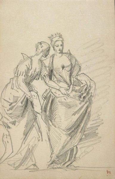 Curator: This drawing, "Figures, after Tintoretto and Veronese" by John Singer Sargent, captures figures reminiscent of the Renaissance masters. What strikes you first about it? Editor: It feels unfinished, but in a good way. Like a glimpse behind the curtain, revealing how the artist's mind works. What resonates for me is the raw emotion of the figures, they're so evocative. Curator: Sargent was deeply inspired by the Venetian masters, Tintoretto and Veronese. He studied their use of light and dramatic composition and this is reflected in the figures he draws. Editor: I see that drama, definitely. There is something very compelling in how Sargent distills down their dynamism into these quick sketches. The crouching figure seems to echo a tragic or burdened emotion. It has an immediacy that's quite modern. Curator: Absolutely. We can see here a lineage, a visual echo of cultural memory passed down through artistic interpretations. Editor: It's wonderful to see an artist engaging so directly with his predecessors, and creating something new in the process. Curator: Indeed. It offers a glimpse into the continuous dialogue between artists across time. Editor: Well, I'm now seeing this less as a study and more as a conversation. Thanks for pointing that out.