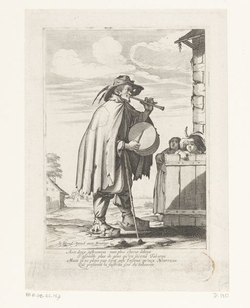 Pieter Langendijk created this etching called "Man zittend in bakje", or "Man sitting in a tub," sometime in the late 18th century. The poem inscribed beneath the image encapsulates the spirit of self-reliance and perseverance that defined much of Dutch society. Consider how this artwork reflects the economic and social realities of the time. The man's resourcefulness suggests the values of the working class, who often had to rely on their own labor and ingenuity to survive. The playful tone of the image belies the underlying themes of labor and self-sufficiency. The man's expression is a mixture of determination and resignation, hinting at the challenges faced by ordinary people striving to make a living. Langendijk’s work invites us to consider the intersection of individual agency and economic necessity, prompting reflection on the dignity of labor and the human capacity for resilience in the face of adversity.