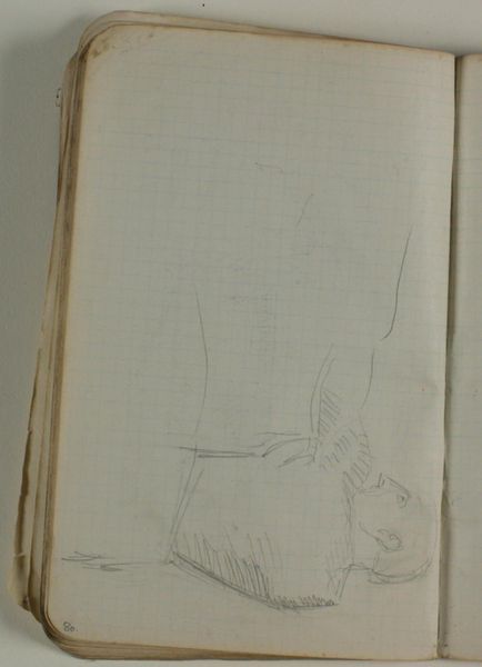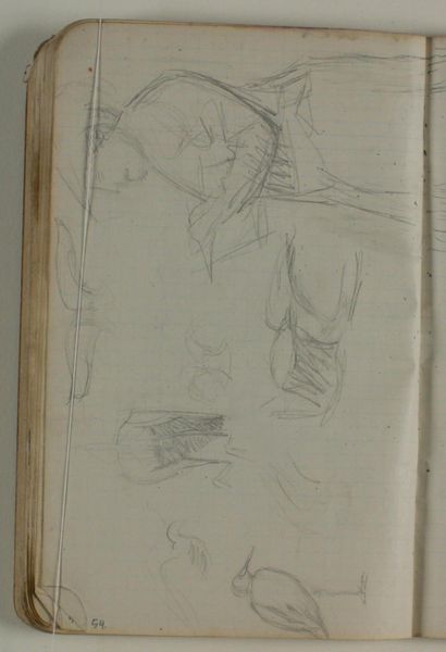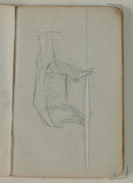 Curator: This drawing by Niels Larsen Stevns, tentatively titled "Skitse af jolle og omrids af fisk," or "Sketch of a skiff and outline of fish," was created sometime between 1905 and 1907, utilizing pencil on paper. What catches your eye first? Editor: The sheer rawness of it! The frantic energy captured by the pencil lines—the artist wasn't aiming for perfection, but rather to capture something fleeting. The very thinness of the paper also signals the disposable function of this sketch. Curator: Precisely! I find it revealing that the work seems almost unfinished. It hints at a search for form, the artist wrestling with both subject matter and perspective, almost like an initial ideation or a palimpsest with images superimposed. Note the prominent location of the boat and the very ghostly suggestion of fish... perhaps there is some intent here. Editor: I wonder about the materiality, the kind of pencil he used. Was it readily available, perhaps mass-produced? Was the paper the cheapest available? It seems crucial to understanding the purpose of such a quick and direct representation. The social status of drawing—its economy, both literally and figuratively—really jumps out. Curator: Interesting. Considering the cultural memory around fishing and boats in Danish coastal life, do you think these images, although sketched, represent fundamental pillars of the Danish experience and its continuity through centuries? There is the symbolism of provision, hard work, the dangers of the sea, as the skiff rides along the ocean current, represented by the lines which flow along with the waves as it navigates the marine environment? Editor: Perhaps. But I'm more interested in where he was drawing this. Was he outside on the beach, experiencing it firsthand, or perhaps relying on previous experiences. To me the context of the work’s production, more than any intentional symbolism, determines how we are supposed to feel when experiencing art in person at the Statens Museum for Kunst. Curator: A fair point! Even in its sketch form, this small image possesses a profound emotional core. Editor: Absolutely, and by acknowledging the hands that sketched and provided the materials of this sketch, it transforms into a captivating historical and social artifact.