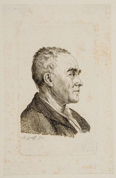 Curator: Before us, we have a remarkable engraving crafted in 1774 by Anton Graff, portraying Johann Georg Sulzer. Editor: Immediately, the austerity of the image strikes me; the almost scientific detail with which Sulzer is rendered makes him seem less like a person and more like a specimen under examination. Curator: Precisely! Graff’s work aligns with the Neoclassical embrace of realism and reason. This portrait, rendered in print, captures Sulzer, a prominent figure in his time. Can you sense the weight of intellect behind those etched lines? Editor: I do, and it begs the question: what does it mean to portray a man of supposed reason with such...dispassion? This isn't a flattering depiction; the etching almost seems to emphasize the wrinkles and folds of his face. Is this realism or commentary? Curator: Perhaps it's both. Consider the time – an era striving for objectivity and enlightenment ideals. The visual language seeks truth, moving away from idealized representations. These lines could evoke intellectual rigor, showing his character and the passage of time etched onto his face. Editor: But to whose "truth" are we speaking? As the patriarchy established and promoted what qualified a person of excellence, we should be mindful when interpreting the artist's intentions or the subject's achievements, regardless of his alleged merit in history. Was he really as important as history says? Curator: Well, in the context of its time, this portrait might suggest importance by simply existing as an engraving—a visual symbol commemorating Sulzer’s presence and contributions. Even the artistic process mirrors his achievements. Editor: Yes, I see your point, yet I find myself thinking about the silent narratives here, the individuals outside the frame. Who were the female philosophers overlooked, the thinkers of color excluded? This image makes me consider visibility as a construct, then and now. Curator: Your insights have pushed me to view the image anew. It's incredible how this piece can hold multiple layers—historical record, aesthetic form, and even prompts for challenging dominant narratives. Editor: Absolutely. And recognizing those tensions helps us engage more fully with art and with history.