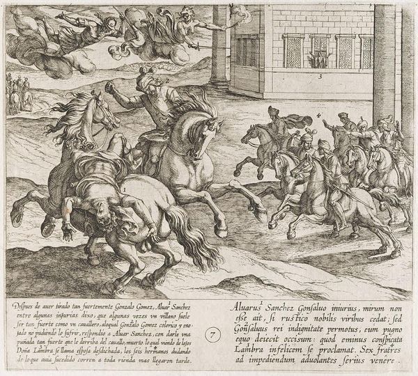 This print, titled 'Herodes laat spelen opvoeren in Caesarea', presents a scene teeming with figures and architectural elements, all meticulously rendered in black ink. The overall effect is one of dynamic energy, created by the artist’s use of densely packed forms and contrasting areas of light and shadow. The composition is structured around two obelisks, which divide the space and draw the eye through different planes of action. The foreground is dominated by a chaotic melee of animals and figures, while the background reveals an architectural setting reminiscent of a Roman amphitheater. The artist employs a semiotic system of representation, using visual cues such as the obelisks to suggest a sense of power. This creates a play between the spectacle of violence and the order of architectural forms. Note how the contrast between the foreground’s chaotic action and the background's structured architecture serves to destabilize any fixed meaning. This invites ongoing interpretation of power, order, and spectacle within the depicted scene.