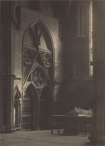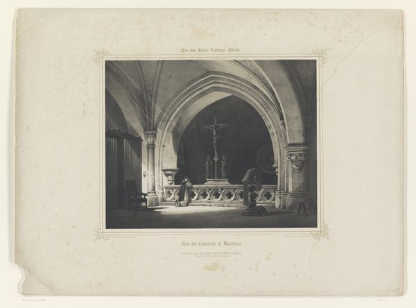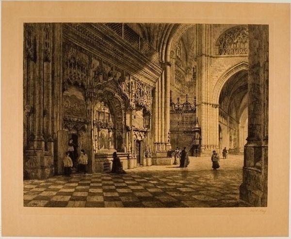Editor: Here we have Turner's "Interior of a Church," and what strikes me most is the contrast between the grandeur of the architecture and the smallness of the figures. How do you interpret that interplay? Curator: Ah, Turner, always the poet of light and space! I see here a meditation on faith, perhaps. Those soaring arches—do they lift your spirit? They whisper of the divine, while the tiny congregants remind us of our humble place within it all. Does the sepia tone enhance a sense of solemnity for you? Editor: It definitely gives it a kind of aged feel. I hadn't thought of it as a statement about faith, more about architecture. Curator: Perhaps it's both, then, a dialogue between the earthly and the ethereal, wouldn't you say? Editor: I think I agree. Thanks for opening my eyes to that! Curator: My pleasure! Turner always leaves room for our own interpretations, doesn't he?