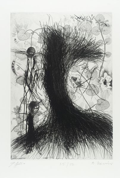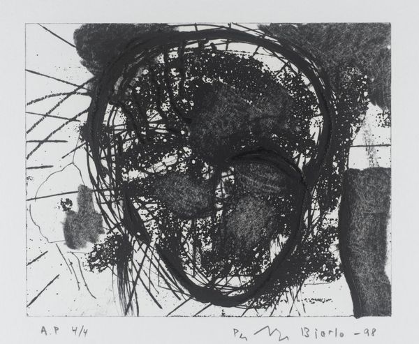 Curator: Here we have Per Inge Bjørlo’s "Head XII," currently part of the Tate Collections. The image measures approximately 282 x 227 mm. Editor: It looks like the inside of someone's head, a tangled mess. I can feel the texture just by looking at it. Curator: Bjørlo's focus extends to the socio-political implications of mental states. It's a study of interiority, reflecting psychological turmoil in postwar art. Editor: Look at the layering! The artist really worked the plate to achieve this density. How the ink clings and pools speaks volumes. Curator: Indeed. Its stark palette speaks to the anxiety pervading the late 20th century art scene. I'm struck by the political undertones of representing inner chaos. Editor: Considering how this was made adds another layer to the interpretation. The hands-on process suggests a direct connection with the artist's psyche, don't you think? Curator: A compelling argument! This has given me a new perspective on the role of printmaking in conveying complex emotional states. Editor: Yes, seeing the physical involvement changes the way I consider the finished image.