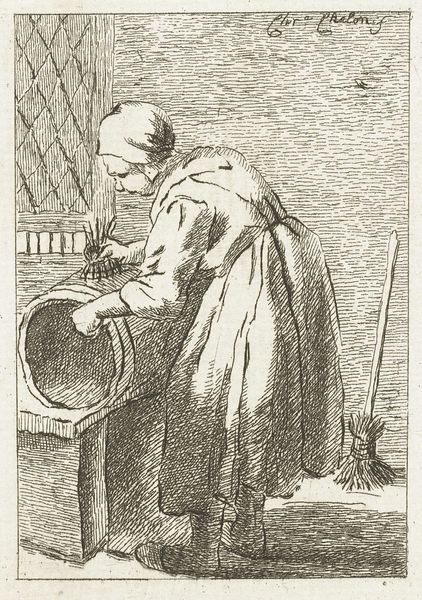 Curator: Here we have an intriguing, unsigned print, "The Organ Grinder with A Magic Lantern", currently held at the Harvard Art Museums. Editor: It strikes me as rather melancholy. The figure's posture, the stark lines... there's a sense of hardship. Curator: Indeed. The printmaking process itself, likely etching or engraving, would have demanded considerable skill and labor. Consider the social context—it portrays a street performer, dependent on meager earnings. Editor: And the magic lantern, a potent symbol of illusion and entertainment offered to the masses. It hints at dreams, or perhaps escape, for those living difficult lives. Curator: It also raises questions of accessibility. Who had the means to produce and consume such images? What kind of exchange took place? Editor: To me, the lantern and organ represent the flickering promise of joy amidst daily struggles, suggesting the resilience of the human spirit. Curator: A worthwhile reflection, especially considering we may never know the identities of either the artist or the subject depicted. Editor: A somber yet fascinating image, hinting at larger narratives of labor, spectacle and the human condition.