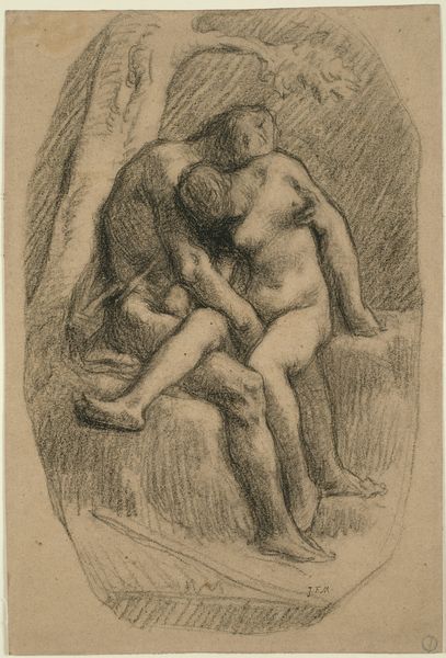 Editor: This is "Der Blick (The Gaze)," an etching by Karl Hofer from around 1900. It depicts a man and woman looking intently at each other, their bodies almost merging. The starkness of the etching lends a certain weight to the image. How do you interpret this work? Curator: The print presents an interesting formal tension. The rough, almost primitive etching technique contrasts with the refined subject matter, the two figures locked in an intimate gaze. Note the use of line: erratic in the background, suggesting an almost turbulent emotional space, while softer, more flowing around the female figure. Editor: The background does seem very busy compared to the figures themselves. Was Hofer trying to emphasize their isolation? Curator: Perhaps. Or perhaps he was interested in creating a dynamic interplay between the figures and their surroundings. Consider the way the dark, dense lines of the man's suit contrast with the lighter, more open form of the woman's dress. This creates a visual push and pull that draws the eye around the composition. What do you make of the composition and space in terms of creating the effect on the viewer? Editor: That's a good point, their contrasting forms create dynamism, especially since they’re seemingly floating. And I hadn’t considered the contrast between their garments either. Curator: Indeed. Formal analysis allows us to consider not only what the work depicts, but how its visual elements contribute to its overall meaning. Editor: I’m starting to see so many layers beyond just the subject! Curator: The power of the artwork relies on Hofer's conscious structural choices. Thinking about the arrangement and form has completely transformed how I perceive this artwork.