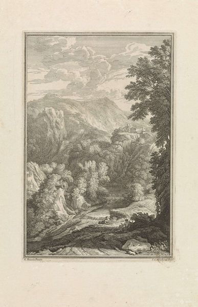 Curator: So, what are your initial impressions of "Berglandschap met twee figuren," a landscape attributed to Monogrammist JADV from 1791? It's rendered in engraving, with incredible detail. Editor: My immediate reaction is of drama and a slightly romanticised sense of wilderness. The high contrast in the engraving makes the scene feel quite intense. Curator: Absolutely, the linear work emphasizes the steep, rugged mountains, characteristic of Romanticism's interest in the sublime. I am fascinated by the composition—the figures are dwarfed, seemingly overwhelmed by the immensity of nature. Do they strike you as symbols of something beyond just human presence? Editor: For me, they represent the ongoing struggle between humans and their environment. I find it compelling to interpret these figures in a social context: their diminutive size emphasizing the precarity of labor, even as it romanticizes an age of exploration and discovery. The natural world seems to expose disparities between human actions and intentions. Curator: Interesting! I hadn't considered that reading. Perhaps the figures also underscore the artistic ideology of Romanticism, one marked by freedom from the formal restraint characteristic of earlier artistic movements. Editor: I appreciate your focus on freedom— I see that visual choice as linked to contemporary notions of emancipation. These images become associated with wider liberation movements as people began to challenge the constraints imposed by monarchy and church. Curator: I like how you connected Romanticism's visual style with emerging socio-political transformations! Editor: Thanks! The composition seems staged for dramatic impact to reveal those societal contradictions. In many ways the iconography seems rooted in revealing imbalance, particularly around power and progress. It seems more complex when considering who exactly could participate in art in this period. Curator: It certainly is rich with those contradictions. Thinking about the cultural memory embedded in images like this is essential—tracing how meanings shift yet stay tethered to the era that gave rise to them. It gives us space for re-imagining better worlds in our own moment. Editor: Exactly. Understanding art like this reveals the social and philosophical dimensions of our world, and this intersectional reading definitely feels imperative when engaging historical pieces!