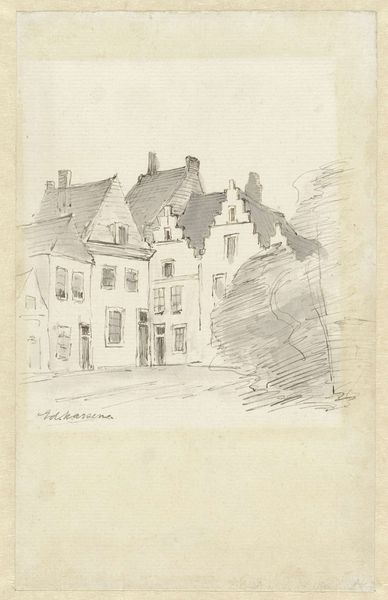 Curator: "Old Houses, Stirling," an etching from 1892 by David Young Cameron. Looking at this closely, it seems like he used the etching needle to trace the memory of that historical site in Scotland. What is your initial take? Editor: There is a haunting atmosphere. The figures are cloaked, indistinct. There's a density to the shadows that suggests more than just architecture, but rather the weight of time. It is more dream than a street view. Curator: Agreed, the deep shadows. The use of etching captures something really profound here. We often read the cloaked figure as representative of mystery or impending events in the cultural imagination. But here they also symbolize memory. In "Old Houses, Stirling," Cameron invites the viewer to step back in time, engaging with a historical tableau of a medieval Scottish town. It’s Arts and Crafts but with this very particular vision. Editor: Precisely, these deep shadows. The art and craft movement here is less about decoration than revealing an authentic vision. Those indistinct figures—are they even meant to be individuals, or more like specters of past lives imprinted on the scene? There's also a stark realism to the architectural detail that makes this quite impactful. It's not just about aestheticizing the old; it's showing the conditions in which life was lived. Curator: Think about this composition. He hasn't idealised those medieval ruins for the viewers, but represented it with a deep, respectful observation. By the way, the cultural significance of Stirling lies in its historical position as the gateway to the Highlands, which probably made Stirling a stage for countless historical dramas and power struggles. Cameron probably wanted the people who come across this artwork, not just the townscape and architecture. The historical significance is as powerful as its composition and visual appeal. Editor: And perhaps by reducing those figures to mere suggestions, he's acknowledging the difficulty in fully knowing the past. It’s also highlighting the anonymity of history and those everyday individuals—as historical accounts tend to highlight heroic personas. It asks: Who lived in these houses, what were their names and the important dates of their lives? What do they care about? And how much is permanently unknowable? That seems significant to me. Curator: I concur entirely. It has left us something to ponder indeed. Editor: Definitely, this isn't just a cityscape. It’s a glimpse into another time and place, which evokes far more questions than answers, a remarkable meditation on our collective historical memories.