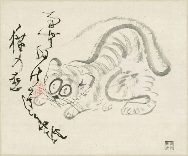 Editor: This is Xu Beihong’s "Kitten with Butterfly," painted in 1944 using ink and watercolor on paper. It’s charming; I'm struck by its delicate brushstrokes, but how would you interpret this piece? Curator: Consider the dynamism created by the juxtaposition of the static, seated kitten, and the butterfly in motion. The stark contrast between the dark ink washes of the kitten's fur and the lightness of the paper contributes to a visual tension. How does this push-and-pull between stillness and movement affect your reading of the work? Editor: I see what you mean. The artist seems to be exploring contrasts, between the solid kitten and airy butterfly, but also with the texture of the rocks, that seem flatly represented, yet give a 3D illusion. Curator: Precisely. Beihong’s expressive brushwork generates contrasting textural elements that enrich the piece's complexity, and it also adds depth to the otherwise minimalist setting. This attention to brushstroke technique, and deployment of blank space—essential elements of traditional Chinese painting—create a potent formal tension. Note, too, the relationship created between calligraphic inscription and the main image. Editor: Ah, the inscription! It's part of the work's formal construction as much as the painted elements, isn't it? The texture almost mimics the fur. Curator: Precisely. Form is content here. Editor: I never really looked at Chinese painting like this. Thanks for pointing out these formal qualities; I notice the textures, the line quality, and relationship between word and image so much more now. Curator: You’re most welcome; thinking this way helps us notice so much.