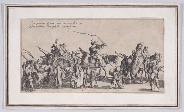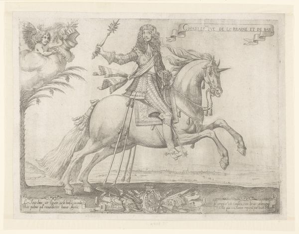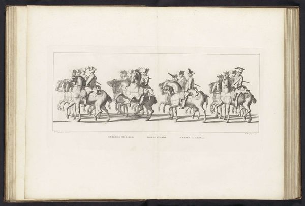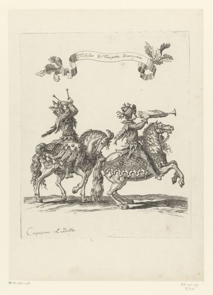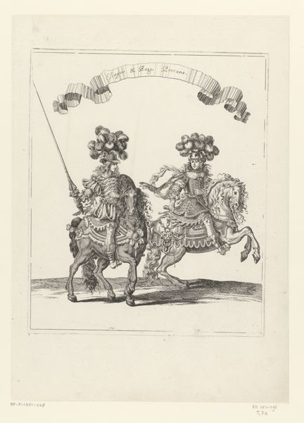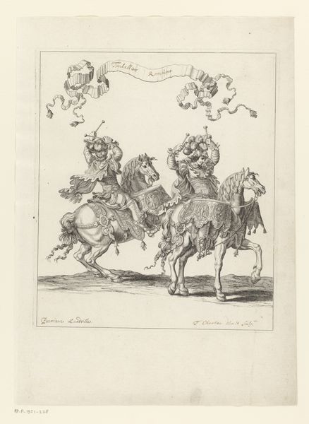 Curator: Oh, the grandeur! The first impression that hits you is the confidence of those rearing horses and flamboyant costumes. What do you think? Editor: It certainly has a swagger to it. Looking closer, this pen and ink drawing, housed here at the Rijksmuseum, is "King Louis XIV on Horseback with Two Riders on Either Side in Roman Costume" by François Chauveau, created around 1670. Curator: The Sun King! Chauveau really captures that sense of absolute power, doesn't he? It’s interesting he chose the medium of ink sketch for such a lavish display. The lightness in execution makes the over-the-top opulence seem, I don't know, almost theatrical? Editor: I see a deliberate staging of power here. The Roman costumes are more than mere fancy dress; they consciously tie Louis to the legacy of Roman emperors. That elaborate headdress on the central figure evokes images of power and the classical era all at once. He isn’t just a king; he's Caesar reborn. Curator: Absolutely! And consider those flanking figures. Are they symbols, almost archetypes, representing, perhaps, military might or royal duty? They’re certainly not just along for the ride. Editor: Precisely! It's a tableau vivant. Chauveau uses symbolism to construct a narrative. Notice how the figures are evenly spaced, suggesting not just procession, but also inevitability and order. It's not just about Louis the man; it's about the idea of monarchy itself, presented as ordained, powerful, and eternal. Curator: It’s interesting to see Chauveau almost playfully sketch with a frenetic energy. The detail is gorgeous when you look close. Those tiny flicks of ink creating texture. The overall effect dances that knife-edge balance of grand illusion and fleeting reality. Editor: You know, I was thinking about the medium as well. Ink is enduring. While appearing spontaneous, the choice solidifies Louis' reign and presence into permanence through the act of committed linework, capturing the fleeting spectacle and lodging it into the cultural memory. Curator: So, a fascinating glimpse into both the self-fashioned image of a powerful ruler and the artistry behind crafting such an image. I’ll not soon forget it. Editor: Indeed, an elegant exercise in imbuing temporal power with timeless symbols. Food for thought, indeed.