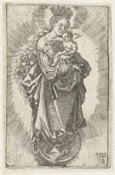 Editor: Here we have "The Virgin and Child on the Crescent" by Lucas van Leyden, an engraving. The stark black lines create an almost ethereal quality, especially with the radiating light. What layers can you unpack for us within this image? Curator: Well, let’s think about the role of the Virgin Mary within broader social structures. This image isn't just about maternal love, it’s about power and the construction of ideals. The crescent she stands on is both a symbol of purity and, potentially, a reclaiming of pagan lunar deities absorbed into the Christian narrative. What does that visual co-opting mean in the context of 16th century Northern Europe? Editor: That's fascinating. I hadn't considered the crescent having pagan roots. So, are you saying the image isn’t only about religious devotion but also a kind of… negotiation of power? Curator: Precisely. And think about the context of the Reformation brewing during van Leyden’s time. Images of the Virgin were intensely debated – venerated by some, condemned as idolatry by others. This print would have actively participated in that very fraught theological discourse. How does her serene yet sorrowful expression sit with you now, knowing that? Editor: It definitely complicates the reading. Her quietness now feels loaded, like she’s holding space for that tension. I used to view it just as a symbol of maternal care, but now, thanks to you, I see its place within those much wider sociopolitical crosscurrents. Curator: And those multiple layers are what make art so perpetually resonant. Hopefully this nuanced perspective resonates with the viewer too!
