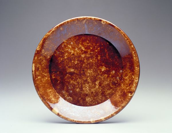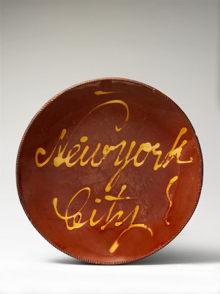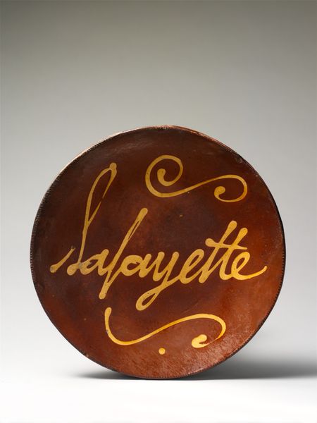Curator: Here we have a plate dating from approximately 1830 to 1867. It’s an example of American folk art held in the collection of the Art Institute of Chicago. Editor: What strikes me immediately is the earthiness of the color palette. The raw sienna of the clay, the way the light glances across its surface, and how that simple spiral balances the cursive script. There is an unrefined beauty in that. Curator: Absolutely. These pieces, particularly those from the Pennsylvania German community, often served as gifts. What appears to be "Sally" inscribed across the surface could denote the intended recipient. Food served on the plate, a daily offering and nourishment, reinforces that act of care and strengthens familial or community bonds. Editor: The inscription, rendered with such unpretentious flourish, speaks to a local tradition of craft. What is your assessment of its overall form? Does its construction suggest a utility purpose or something else entirely? Curator: While practical in some regard, its primary role transcends functionality. The plate is symbolic—an emblem of affection and heritage rather than a simple food vessel. It speaks to a history of immigration patterns and cultural traditions being imprinted on everyday objects. Editor: The circle motif repeats; it is self-contained. One could argue that, with the spiral detail and unadorned design, it invites a modernist reading as much as a folkloric one. A clean, graphic sensibility. Curator: Agreed, but the handmade imperfection—the slight irregularities in the rim—lend it a distinct authenticity modern design often lacks. It resists being neatly categorised; it exists outside the commercialised mass-produced image world. It preserves something unique. Editor: And therein lies its power—bridging functionality, symbolism, and the simple grace of handcrafted art. Curator: Exactly. A testament to the stories objects can hold.