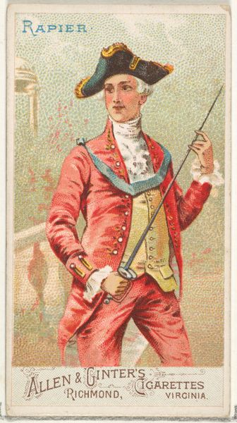 Curator: This is “Fox Hunting,” from the World's Dudes series, a lithograph produced by Allen & Ginter in 1888 as part of their cigarette card sets. Editor: What a dandy! My first impression is one of caricature; the exaggerated posture, the monocle, and that magnificent moustache practically vibrate with self-importance. Curator: Indeed. These cards were intended to promote tobacco sales, portraying idealized images of sophisticated masculinity. The choice of fox hunting is particularly telling. It represents leisure, wealth, and the established social order. Editor: It's fascinating to consider the production process. Each card would have required a design, printing, and inclusion in cigarette packs. These seemingly disposable objects became powerful tools in shaping social ideals and consumer habits. What inks were used in the print process, and who were the artists and laborers who printed it? Curator: Absolutely. These cards weren't simply about selling cigarettes, but about selling a lifestyle. The romanticized portrayal of fox hunting elided the darker realities of class division and animal exploitation. The mass production and consumption of these images solidified existing power structures. Think of the tobacco farms, too. Editor: So the simple act of buying a pack of cigarettes became intertwined with endorsing a whole social framework. Today, the imagery might read ironically. Is that shift due to changing tastes and social values? Curator: Precisely. We're now more attuned to the ways in which images like this normalize inequality. However, in its time, it subtly influenced desires, class aspiration, and participation in consumer culture, so we have to study and remember it as part of history. Editor: So, in considering the full life cycle of this humble cigarette card, we’ve moved from inks and factory processes, to consumption, class, labor, and changing meanings in time. Quite a journey! Curator: It does serve to remind us of the rich stories behind even the smallest artworks.