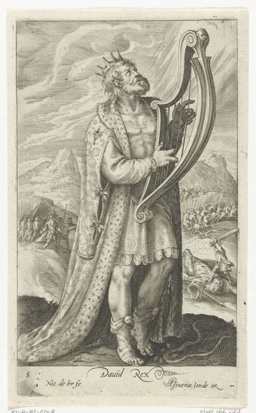 This engraving of Saint Susanna of Rome, armed with a sword and palm, was made by Pieter de Bailliu. Observe how Susanna's figure is constructed through a series of elegant lines and tonal gradations. These lines aren't just descriptive, they define the very structure of the image, and the interplay of light and shadow gives a sense of volume. Her halo is an array of lines which radiate outwards, suggesting an almost explosive visual energy that both contains and transcends her form. Consider how the composition invites a reading into the historical and symbolic context. Susanna, a symbol of resistance, stands with a sword, challenging the established norms. This subversion is not just thematic but also formal. De Bailliu is not merely representing Susanna; he is presenting an image that invites us to question fixed meanings and to engage with the dynamic interplay between form, symbol, and cultural narrative.
