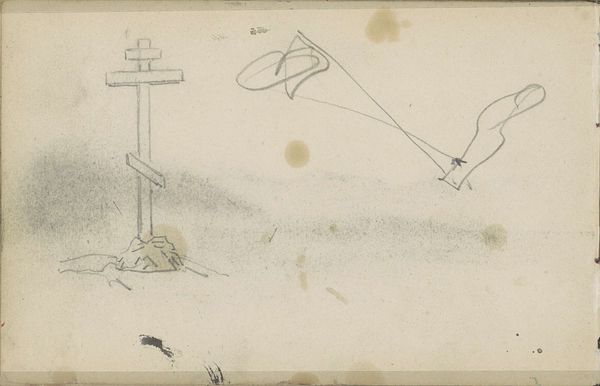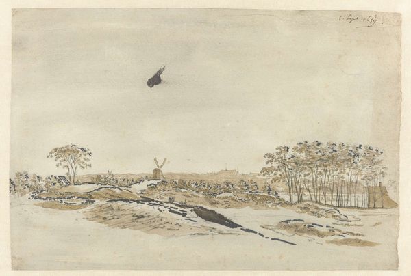 Curator: This is a drawing titled "Zeilschepen en een landschap met bebouwing," or "Sailing Ships and a Landscape with Buildings," created around 1880 by Louis Apol. It's rendered in pencil and exemplifies the artist’s interest in capturing scenes of Dutch life with a realist sensibility. Editor: It has a wonderful sense of immediacy, almost like a captured moment from a travel journal. The lines are minimal but manage to convey such a vast expanse, don't they? The starkness against the aged paper creates a nostalgic feel, like uncovering a forgotten memory. Curator: Indeed. Apol was known for his landscapes, often focusing on winter scenes. He documents the lived environment through naturalistic style but avoids explicit political themes, characteristic of his involvement with the Pulchri Studio, a group committed to artistic freedom. Editor: But there's a subtle undercurrent, perhaps a commentary on industrialization or the changing Dutch landscape. Sailing ships evoke tradition, and their presence juxtaposed against 'buildings' hints at urbanization. Does this suggest the displacement of rural communities? The tension in this scene seems incredibly potent. Curator: That’s a fascinating interpretation, although perhaps one Apol didn't overtly intend. Apol was invested in atmospheric quality, and the ships function as aesthetic objects in the vastness of space. The buildings are secondary, only providing spatial depth to the piece. Editor: Perhaps. I tend to approach the definition of ‘intended’ very flexibly, however, particularly when looking at art historically. Even seemingly apolitical art operates within—and reflects—social structures and norms of the time. The buildings representing industry and urbanization subtly impose themes that impact cultural identity. Curator: True, one can consider the drawing within the larger social context. Certainly, it contributes to a national artistic discourse through an aesthetic depiction of labor and the land. Editor: Precisely! For me, that intersection—between Apol's personal observations, Dutch artistic styles, and the underlying forces changing society—makes this more than just a landscape sketch. It's a record of how the Dutch navigated the tensions between their traditions and inevitable change. Curator: Looking at it in that context adds another dimension. It allows a richer reading, and invites further consideration of how national identity evolves visually through art. Editor: Absolutely. It’s those conversations that keep these works alive.