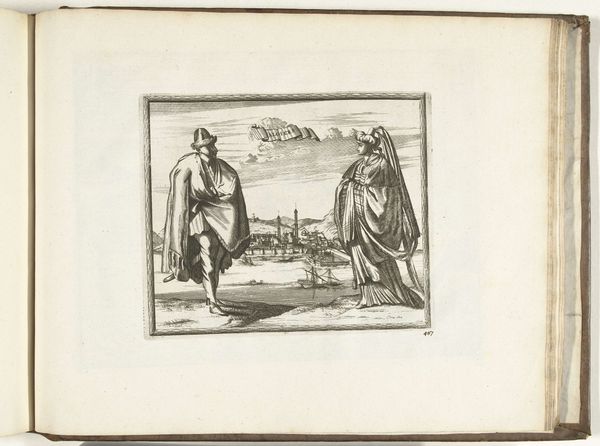 Carel Allard produced this etching of ‘Inwoners van Tunis’ in 1726. Look closely, and you'll see Allard's depiction of a man and a woman from Tunis set against a landscape featuring the city itself. The clothing of the figures offers a glimpse into the social norms and cultural expectations of Tunis at this time. The man is dressed in what might be considered traditional attire, but it’s the woman’s garment that perhaps speaks volumes. Fully veiled, her clothing is indicative of the complex interplay between modesty, religion, and societal roles that women navigated. How might the experience of a woman in Tunis at that time differed based on her social class or religious affiliation? How did the visual representation of people from different cultures reinforce or challenge existing stereotypes? These are questions that works like this invite us to ask. They remind us that even seemingly simple images can be rich sources of insight into the past.