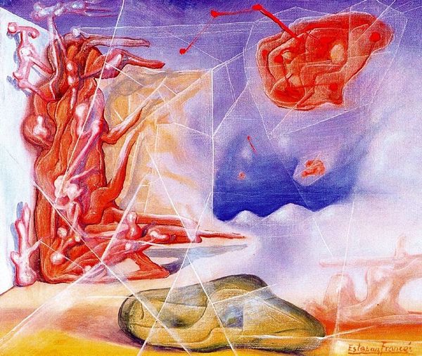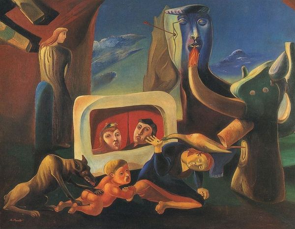 Curator: Remedios Varo's painting, "Creation of the world or microcosm", rendered in oil, presents a unique interpretation of creation. What stands out to you initially? Editor: My first thought is about how meticulously it's painted. You can practically feel the texture of the canvas. The material choices—the paint itself and the panel she's working on—were clearly very important to her craft. Curator: Indeed. Varo interweaves mechanistic and organic elements. What symbolic weight might we attribute to those mechanical vehicles carrying humans and creatures aloft? Editor: The flying vehicles interest me too, as do the whimsical quality to these objects and beings! There's so much detail embedded in her treatment of material culture: the rivets, the seams... I wonder about Varo's engagement with wartime production and post-war anxieties as expressed in the machinery represented. Curator: It’s fascinating to view the symbolism through that lens. The creatures enclosed in these delicate craft suggest something vulnerable, possibly about our internal, fragile, natural world. Do they look trapped or in transit, would you say? Editor: A bit of both, I’d wager. It's tempting to imagine what materials went into this process of her painting as well as building and thinking about this bizarre world. Curator: Varo suggests, visually, a circuit that integrates humanity with the cosmos. Do you believe she’s exploring ideas about agency within this preordained framework? The materials feel so important to the message overall. Editor: The interconnectedness is beautifully eerie, I agree! So, in your reading, these might be emblems of controlled resources – a play on the social relations embedded in raw material production? Curator: Potentially. We could explore the ways she brings in alchemy, the transformative power and inherent value in the work that lies beneath. These objects contain an incredible complexity when it comes to materials! Editor: Agreed. Varo provides so many visual textures to consider—almost a survey of industrial innovation rendered in oil. So many layers, materially, psychologically... Curator: Exactly. It's this combination of materiality, process and unique iconography, reflecting inner worlds, that makes this creation scene feel deeply personal. Editor: Thanks. Seeing these allegorical figures amidst such meticulous and yet very earthly techniques certainly gives me something to think about.