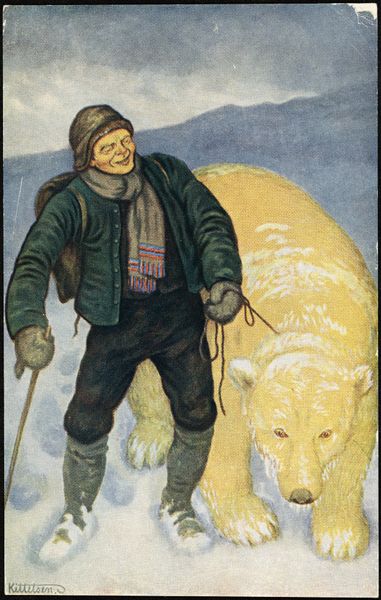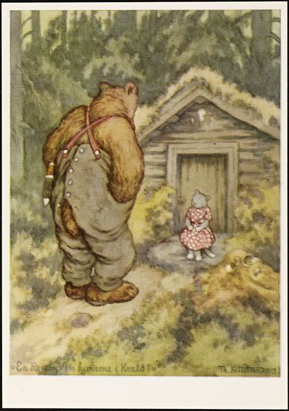 Editor: We’re looking at Theodor Kittelsen’s “Askeladdens Adventure,” painted around 1900 using watercolors. The tones are so soft, almost dreamy. I’m immediately drawn to the relationship between the boy and the bear – it feels very charged and intriguing. What compositional elements strike you most powerfully in this watercolor? Curator: Observe the interplay of light and shadow; it articulates the figures' forms and sets up a subtle dramatic tension. The woodland foliage acts almost as a frame, doesn't it, containing and directing our gaze toward the central pairing. How does the texture, achieved with watercolour, inform your interpretation of the depicted scene? Editor: The fluidity of the watercolor definitely gives it an ethereal, folklore-like quality, almost blurring the lines between reality and fantasy. Is there significance in the use of watercolor specifically? Curator: Precisely. Watercolour's capacity for layering and blending, juxtaposed with detailed figuration, permits the construction of nuanced forms and ethereal depths. Kittelsen manipulates the medium to enhance this sense of otherworldliness, amplifying the fairy-tale resonance. Editor: That’s a fascinating perspective. It's amazing how the materials alone shape the narrative so strongly. I see how much the technical elements and structure can amplify an image’s core impact. Curator: Precisely. Studying the structure informs our experience. A rewarding endeavour!