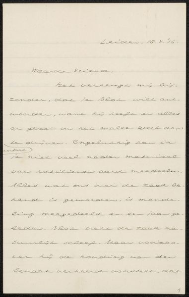 Curator: The image presents Johan Huizinga's "Brief aan Jan Veth," dating possibly from 1920 to 1926. It's an ink and pen drawing on paper, featuring typography. What are your first thoughts when observing this piece? Editor: The letter immediately struck me as a very intimate form of communication, carefully written by hand. It also brings a tactile sense of a historical moment, caught on paper. What details in its composition stand out to you? Curator: Notice the relationship between the density of the writing and the expansiveness of the surrounding paper. The visual weight of the ink creates a textural contrast, almost a conversation between positive and negative space. Editor: So, you're saying that the act of writing becomes almost sculptural through its arrangement on the page? Curator: Precisely. Think of each stroke as a deliberate mark, a unit of meaning but also of visual information. How does the structure of language interact with the structure of the overall design? Editor: That’s an interesting thought. It does bring me to consider the rhythm and flow of the text. Is there a visual cadence established, perhaps through consistent spacing? Curator: Note how the horizontal lines act as a grid. Do you think it imposes order, or is there a tension created by the inherent imperfections of handwriting? Editor: I see a bit of both. The lines establish a certain framework, yet the human element of the writing breaks that rigidity, injecting a sense of individuality and personality. Curator: Exactly! The very nature of this letter transcends mere communication. What have you gained from looking at the artwork in this way? Editor: I've never thought of handwriting in terms of artistic construction, but viewing it this way unveils a depth that goes beyond its linguistic intent. I appreciate how you've brought out the visual texture inherent in what I usually see as simply writing. Curator: And I was glad to see how readily you took note of visual cues and the relation of form and function.