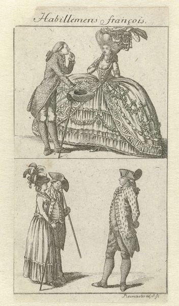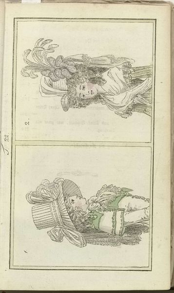 Friedrich Justin Bertuch created this fashion plate around 1790 for the Journal des Luxus und der Moden, using engraving to meticulously capture the details of aristocratic fashion. The composition is neatly bisected, featuring two oval vignettes showcasing elaborate headwear and upper body garments. The subdued palette focuses our attention on the ornate designs. Bertuch employs a delicate network of fine lines to delineate form, texture, and shadow, granting depth to the intricate details of lace, ribbons, and fabric folds. The controlled and precise lines create a structural foundation that articulates each element clearly. These details capture the era’s fascination with ornamentation. The very act of cataloging fashion in visual form suggests an attempt to codify and control the transient nature of style. These sartorial elements reflect social status, and engage with the semiotic system of signs that dictated aristocratic identity. This print doesn't just display fashion, it actively participates in the cultural construction of luxury and modernity.