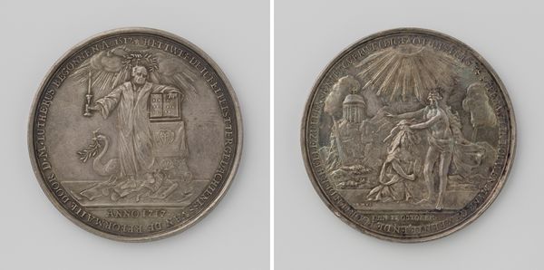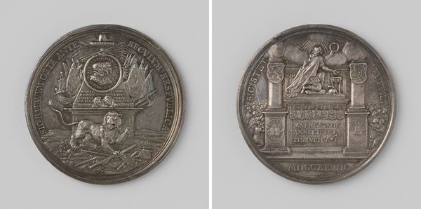 Curator: I'm immediately struck by the intense detail packed into this tiny space. It feels like looking at an entire ocean contained within a silver coin. Editor: You’re right. What you’re describing is a medal created around 1781 by Johan George Holtzhey. It commemorates the naval Battle of Cadiz, a face-off between Dutch and English frigates. The rather long-winded title is "Slag bij Cadiz tussen de Nederlandse fregatten Castor en Den Briel, onder het commando van P. Melvill en Gerardus Oorthuys en de Engelse fregatten Flora en Crescent, onder het commando van Thomas Pake.” You can see it on display here at the Rijksmuseum. Curator: A battle rendered in miniature—the irony is almost unbearable. I’m thinking of all the real lives, the chaos, reduced to a neatly packaged, almost sterile scene. What's the feeling it evoked at the time? Pride? Editor: Certainly, national pride played a role. Medals like these functioned as propaganda. Note the inscription “VIS VI FORTITER REPULSA.” It translates roughly to “Force is bravely repelled by force.” It's an assertion of Dutch naval power and a reminder of defiance in the face of England's growing dominance. Curator: Propaganda never felt so… elegant. Looking closely, there are also intricate symbols of power and heritage on the reverse side of the medal – what does that tell you? Editor: Indeed. On the reverse, we see a coat of arms flanked by flags and weapons, topped by a trident. These aren't just decorative flourishes; they're statements of identity, historical claims, and aspirations to maritime control. And consider the material: silver. Precious, durable, and reflective of power, especially economic power. These objects circulated widely and reminded people that Dutch power existed even in times of strife. Curator: A shimmering emblem of a turbulent history… There's a haunting beauty here, a contained storm frozen in metal. It really encourages reflection. Editor: Absolutely. These medals open a window onto complex narratives of conflict, national identity, and the ways societies choose to memorialize their history, battles, and so on.