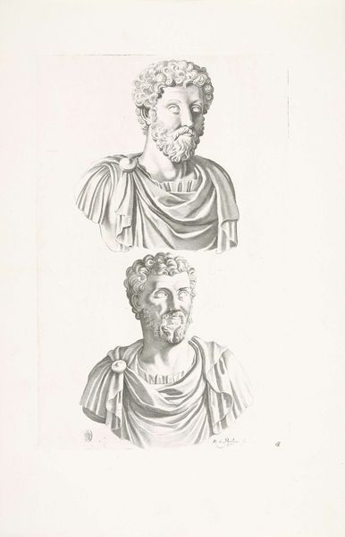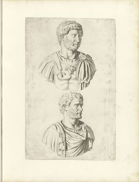 Editor: Here we have "Twee portretbustes," or Two Portrait Busts, an engraving created sometime between 1636 and 1647. I'm struck by the old engraving style and how well the faces carry emotions. What do you see in this piece, considering the figures and their connection to historical visuals? Curator: What grabs me immediately is how these busts tap into the deep well of classical imagery. Look at the drapery, the stylized hair and beards – these are deliberate nods to ancient Greece and Rome. We are meant to recall the gravitas and wisdom associated with those cultures. Editor: So, they're not just portraits, but symbols of something more? Curator: Precisely. They are intended to connect the sitters with that rich history. But note also the small emblems beneath each bust. Those heraldic symbols – what stories might they be trying to convey? Think of coats-of-arms; they represent heritage, lineage and affiliation. They want to attach themselves to virtues of those cultures by visually connecting with iconic symbols of classical art and a heritage that connects their patron to values rooted in wisdom and historical narrative. The very act of commissioning such a piece asserts a specific identity. Does that resonate with you at all? Editor: I do now that you mention it, I didn't even think to look for that level of visual information. It’s a lot more loaded than a simple portrait, then. Curator: Absolutely. These aren't just images of people; they're crafted icons, deliberately constructing a persona through the language of historical and heraldic symbolism. And who chose these specific visual tropes, I wonder, the patron, the engraver, or maybe both? Editor: That makes you think about portraiture completely differently. I’ll certainly look closer next time. Curator: Indeed, every line and emblem potentially holds meaning. A potent reminder of how much our self-perception is a product of our collective memories and cultural symbols.