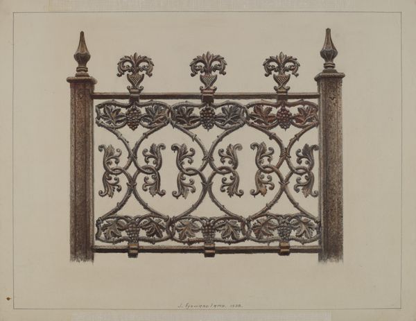 Curator: Let’s discuss Al Curry’s “Iron Gate and Fence,” a watercolor and ink drawing, likely created around 1936. The structure’s symmetrical, detailed design catches the eye. Editor: My first impression is one of enclosure and maybe a bit of somber reflection, don’t you think? The palette is so muted and the gate looks like it barricades entry. Curator: Precisely, the palette contributes greatly. Note how the sepia tones render depth and form, especially in contrast with the flat planes of the wall in the background, reinforcing its architectural presence. Editor: I wonder about the choice of the iron gate as a subject. During the Depression era, the symbolism of exclusion could be interpreted as a commentary on social barriers and economic disparity. Was the promise of the American Dream actually for everyone? Curator: Context is key but it is worth unpacking how each geometric unit comes together. Take the curves, how they intersect in this beautiful cruciform pattern that animates an otherwise hard structure. Note how it softens the hard edges. Editor: Yet even within the delicate filigree and decorative finials there’s an undeniable barrier, an almost oppressive silence—perhaps a critique of the institutional or religious structures represented by the crosses that dominate the visual field. Curator: To reduce this image solely to a metaphor about external barriers seems a bit limiting. I am struck by the artist’s keen understanding of iron work. The meticulous rendering elevates the object to something worthy of careful looking. The linear simplicity underscores the geometry. Editor: Still, I am drawn to how these historical markers also function as powerful metaphors for contemporary forms of confinement. The gate isn't just an object. Its resonance stems from lived experience. It reflects and interrogates structures of power. Curator: Perhaps the true achievement here lies in its capacity to elicit multiple interpretations. Its visual and conceptual components make for a rich tapestry, don’t you think? Editor: Definitely a testament to the way material objects and social contexts interweave. Food for thought.