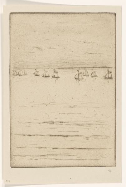 Carel Nicolaas Storm van 's-Gravesande’s etching, 'Fleet at Sea,' presents us with a study in tonal contrast and linear rhythm. The composition is dominated by a series of sailboats receding into the distance. This creates a sense of depth within the frame, yet it also flattens the image, pushing it towards abstraction. The artist’s use of hatching and cross-hatching creates the illusion of form and shadow. This transforms the sails into almost sculptural masses. Note how the repetitive, horizontal lines depicting the water’s surface emphasize the flatness of the picture plane, contrasting with the three-dimensionality suggested by the boats. This interplay between depth and surface can be seen through a structuralist lens, revealing the underlying codes through which we perceive space and representation. The artist plays with these codes, challenging the viewer's perception and inviting a re-evaluation of the relationship between reality and its artistic depiction. This etching embodies the ongoing dialogue between formal elements and conceptual frameworks.