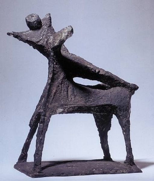 Marino Marini’s sculpture presents us with a bronze figure of a rider atop a horse, with simplified forms and a tactile, almost primal quality. The rough texture and dark patina of the bronze emphasize the materiality of the sculpture. This elicits a visceral response tied to the earth and the ancient relationship between humans and animals. In terms of structure, the statue presents a dynamic tension. The horse and rider, though a single unit, are strained, with the rider gesturing upwards. This creates a visual paradox: the rider looks toward the sky, while his mount is grounded. Marini destabilizes the traditional heroic equestrian statue by making it seem precarious. The rider's pose may be read as an appeal or a warning. Ultimately, this sculpture uses the formal qualities of texture and composition to embody a broader cultural anxiety. The work serves as a potent symbol, encapsulating a sense of unease and calling for constant critical re-evaluation.
